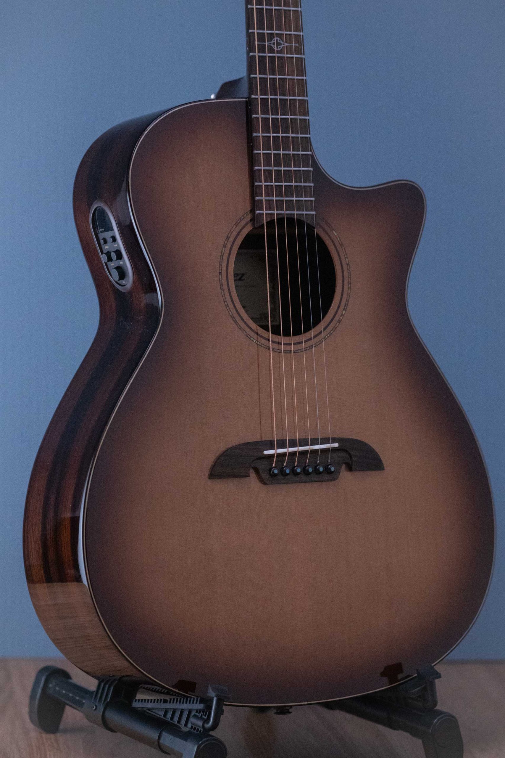 This cutaway model allows for easy access up the neck and is fitted with the LR Baggs StagePro Bronze. The StagePro Bronze is a small-footprint side-mounted EQ incorporating the renowned LR Baggs Element under-saddle pickup. This is a low-profile unit with a large backlit tuner, volume, bass and treble controls and phase. The battery box is built into the end pin jack compartment for easy access with a simple push to open and change batteries.