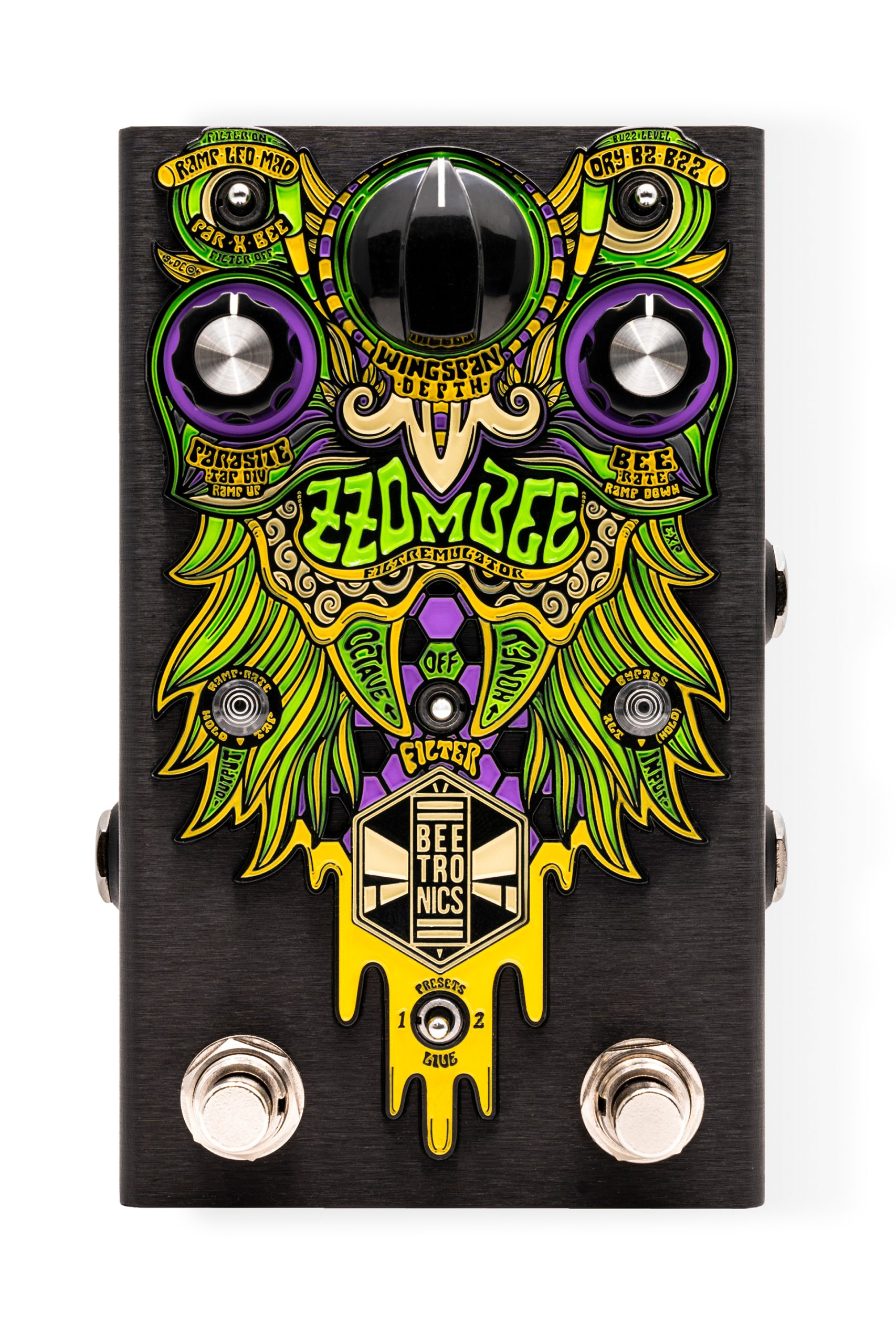 The ZZombee “Filtremulator” is a one-of-a-kind analog multi-effect that delivers filter, wah, LFO, randomized filter, tremolo, swells, overdrive, fuzz, low-octave, and the never-before-heard Honey patented cross tremolo, a very unique kind of tremolo that pulses between the fundamental and a low octave.