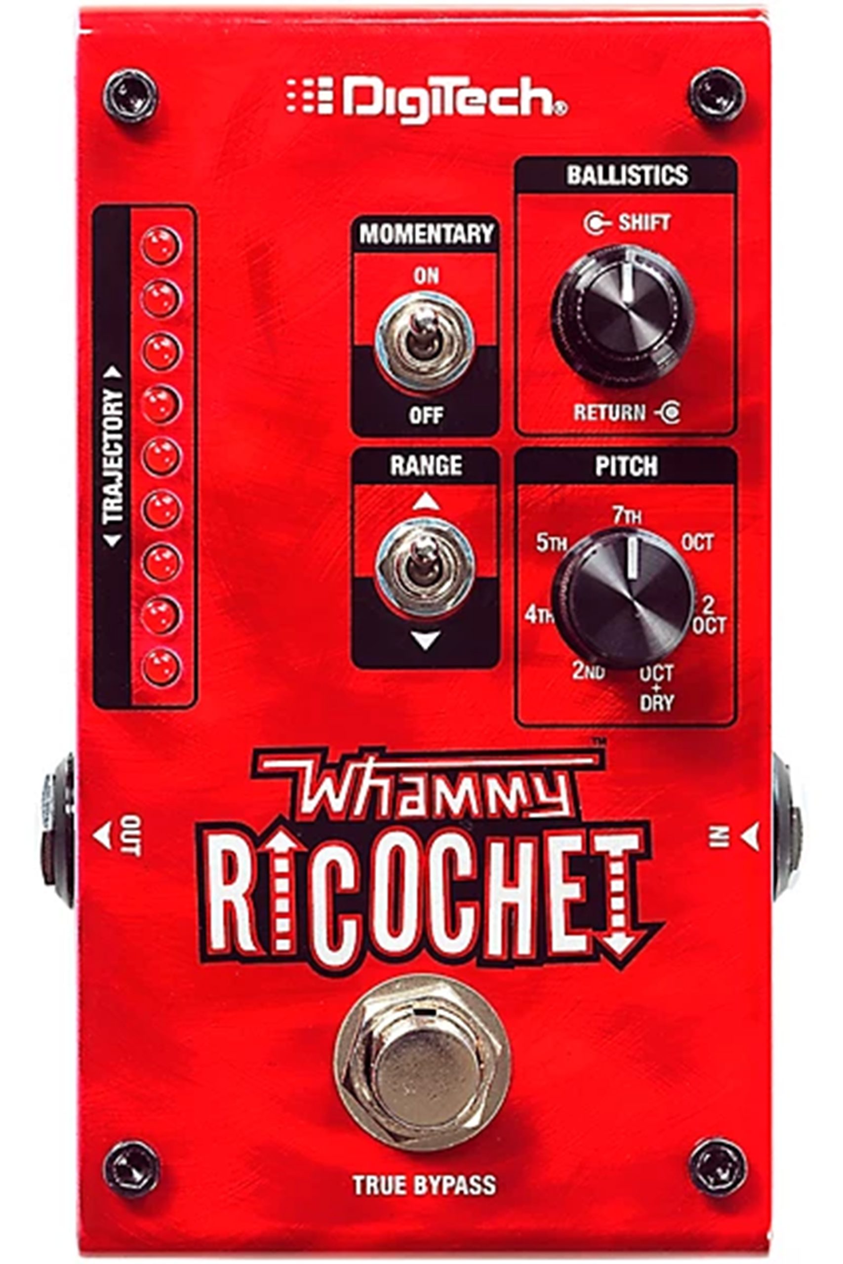 The Whammy Ricochet lets you bounce your playing up or down in pitch in controlled or crazy shifts. A momentary switch and customizable independent rise and fall time ballistics, allow you to get the Whammy action you know and love without the use of a treadle. Just hold your foot on the footswitch and let the Ricochet do the rest. Seven pitch selections – 2nd, 4th, 5th, 7th, Octave, Double Octave, and Octave+Dry, as well as a toggle to select up or down for the selected pitch. The Whammy Ricochet also has latching footswitch mode so you can rise or fall to pitch and stay there, and an LED ladder that shows your shift trajectory at all times.