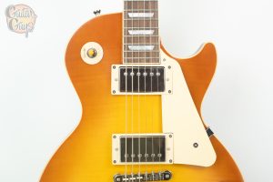 Made in collaboration with the Gibson™ Custom Shop, the Epiphone 1959 Les Paul Standard is Epiphone’s incredible recreation of the rare vintage classic, updated to be more authentic and true to the originals than ever. It features a mahogany body with a maple top with a AAA flame maple veneer, a one-piece mahogany neck with a comfortable ’59 rounded, medium C profile, long neck tenon, and Gibson-style “open book” R9 headstock shape, VOS (Vintage Original Sheen) finish, Gibson Custombucker humbucking pickups, Switchcraft® selector switch and 1/4” output jack, CTS® pots, 50s era wiring, Mallory™ capacitors, non-beveled pickguard, Epiphone Deluxe vintage tuners with Keystone buttons, and a vintage-style brown and pink hardshell case. Play one today, and prepare to be amazed!