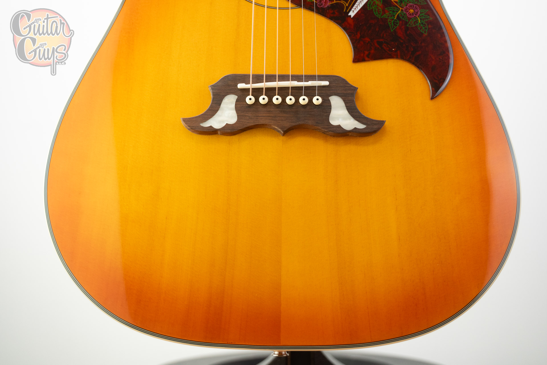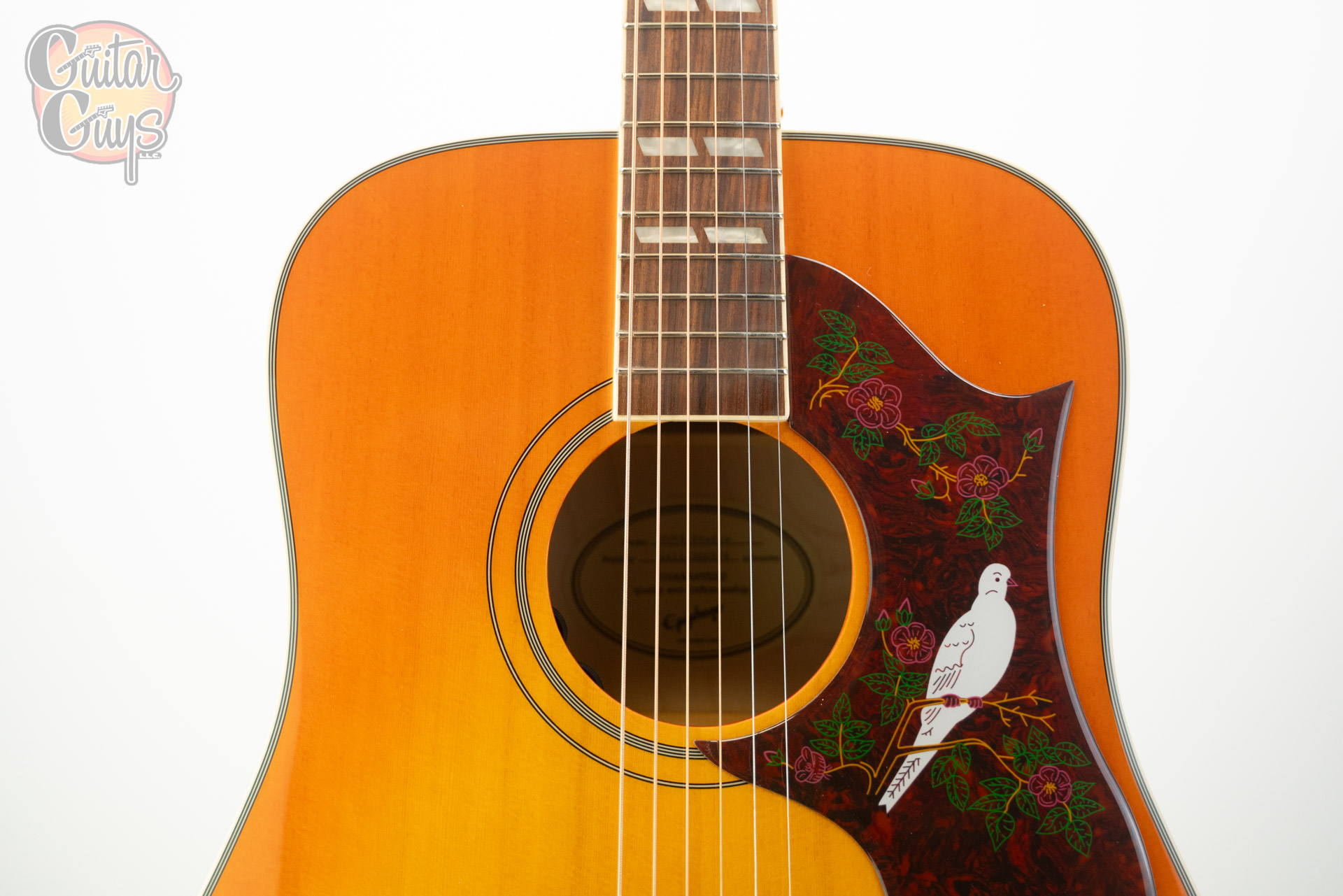 - Pickguard: imitation tortoise with traditional “Dove” artwork