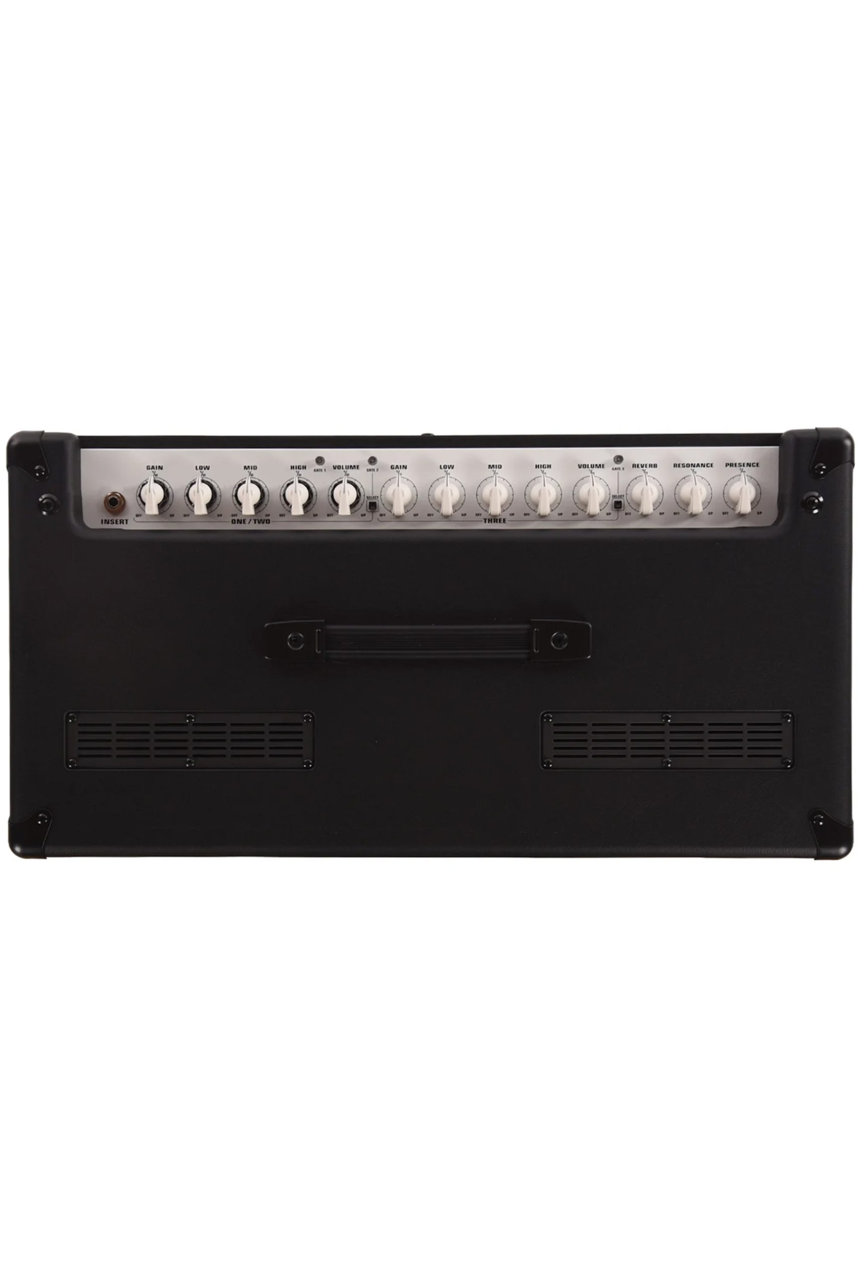 Control Panel: Ch. 1: Independent Gain, Low, Mid, High, Noise Gate Trim & Volume; Ch. 2: Independent Gain, Low, Mid, High, Noise Gate Trim & Volume; Ch. 3: Independent Gain, Low, Mid, High, Noise Gate Trim & Volume