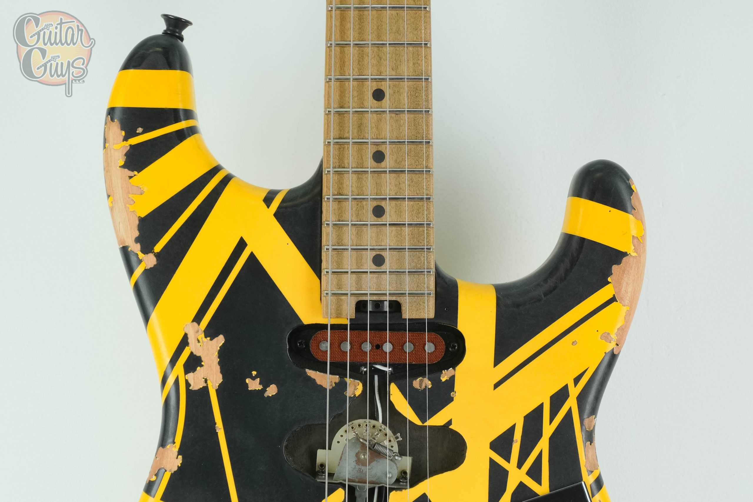 This limited-edition Frankie balances historical accuracy with expanded tonal flexibility. A direct-mount EVH Wolfgang humbucker in the bridge delivers the aggressive bite associated with Eddie’s signature tone, while the functional Strat-style neck pickup adds a clear, articulate voice not present on the original. A push/push volume knob allows instant switching between pickups without adding visual clutter. The unused middle pickup route preserves the iconic stripped-down layout while maintaining the guitar’s original signal path and visual identity.