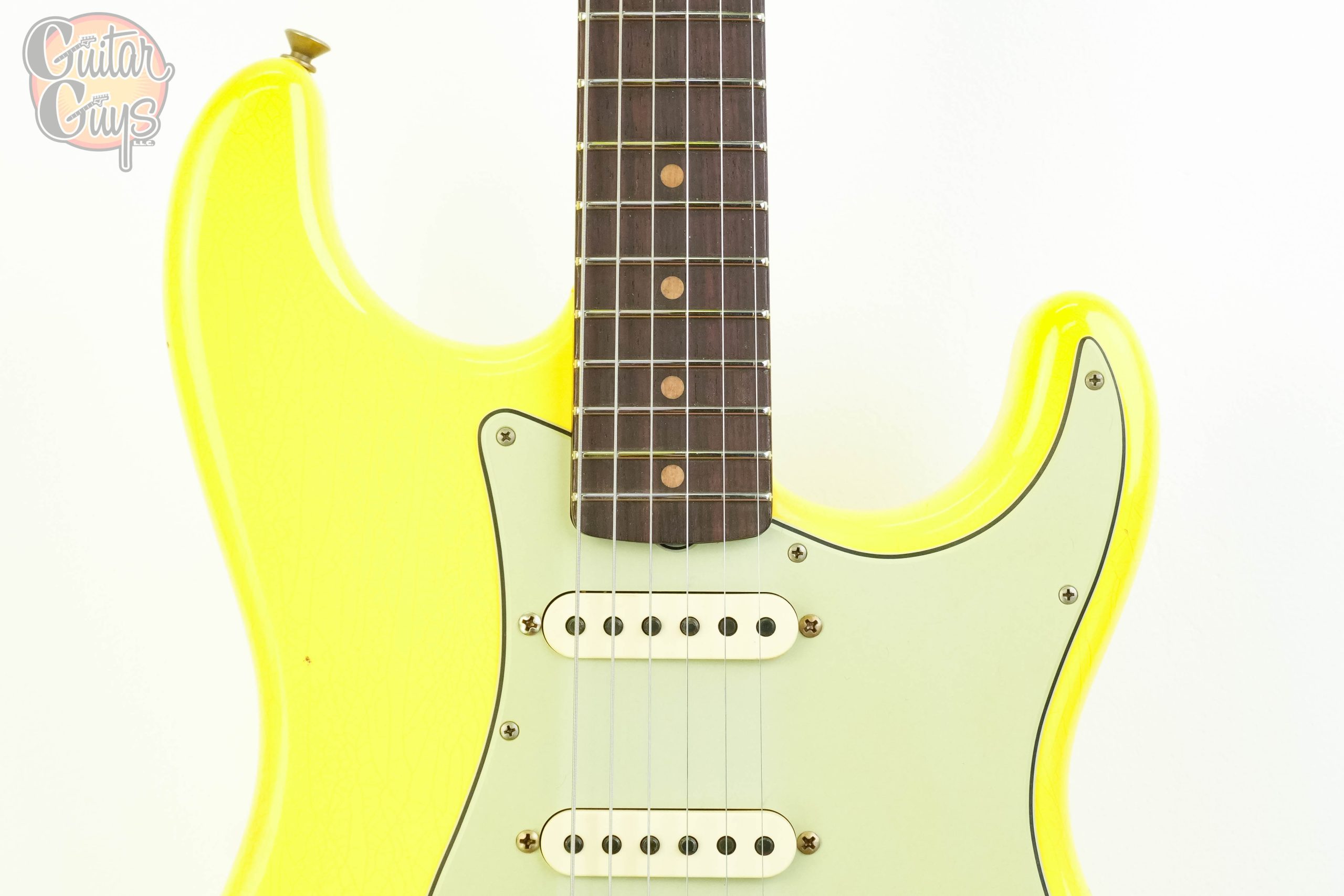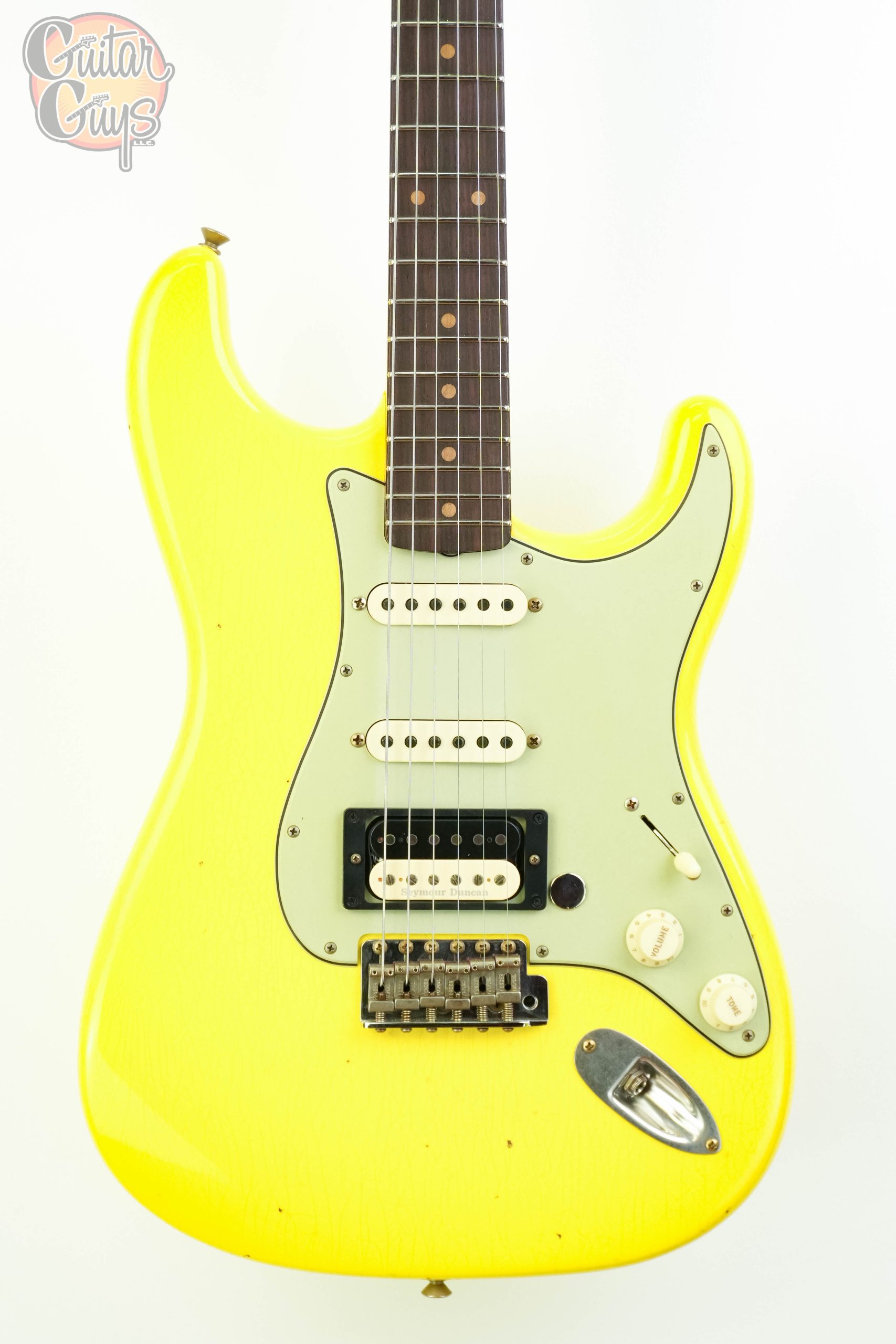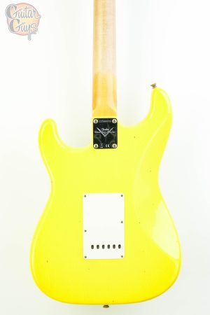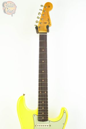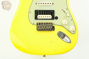 The Fender Custom Shop ’59 Stratocaster HSS Journeyman Relic in Graffiti Yellow is a vintage-inspired electric guitar with a humbucker in the bridge position and single-coils elsewhere (HSS). It features a relic-style finish that mimics natural wear, a 2-piece select alder body, a AA Flame quartersawn maple neck with a 11/56 Off Center V shape and a AAA Rosewood fretboard. The Journeyman Relic finish is less heavily distressed than a Heavy Relic, with playwear on the body and hardware.