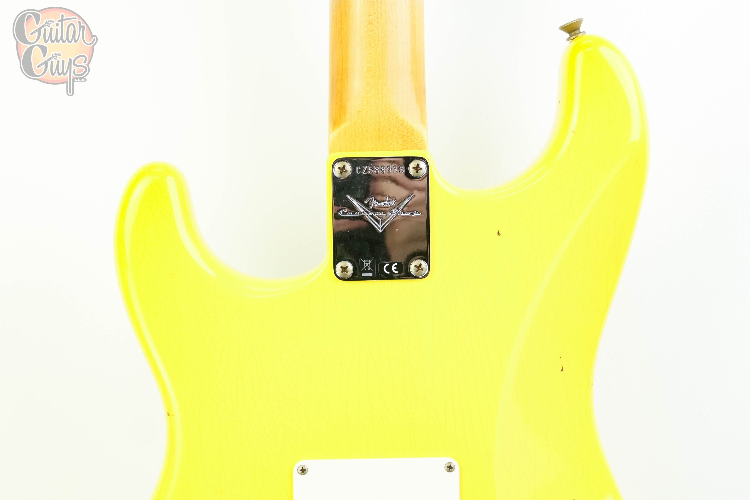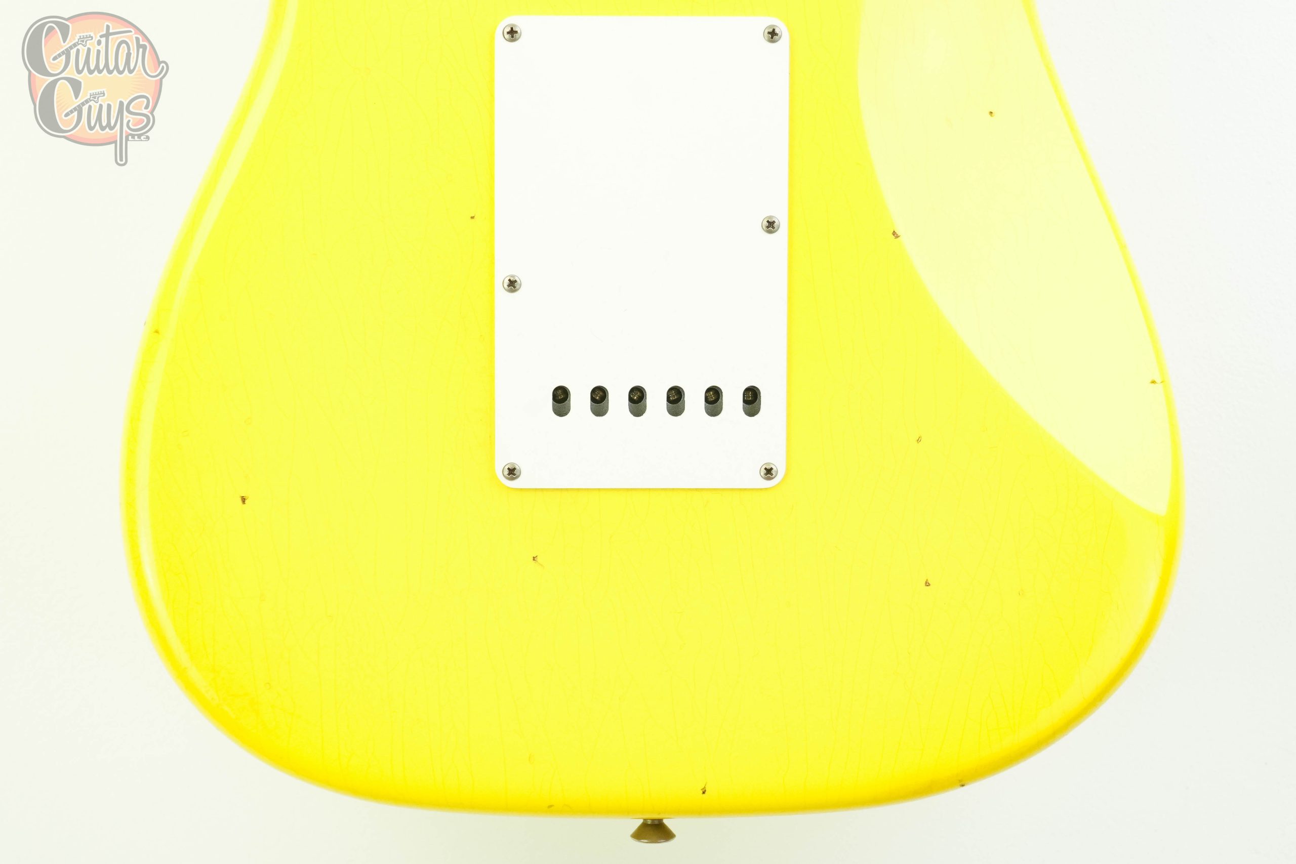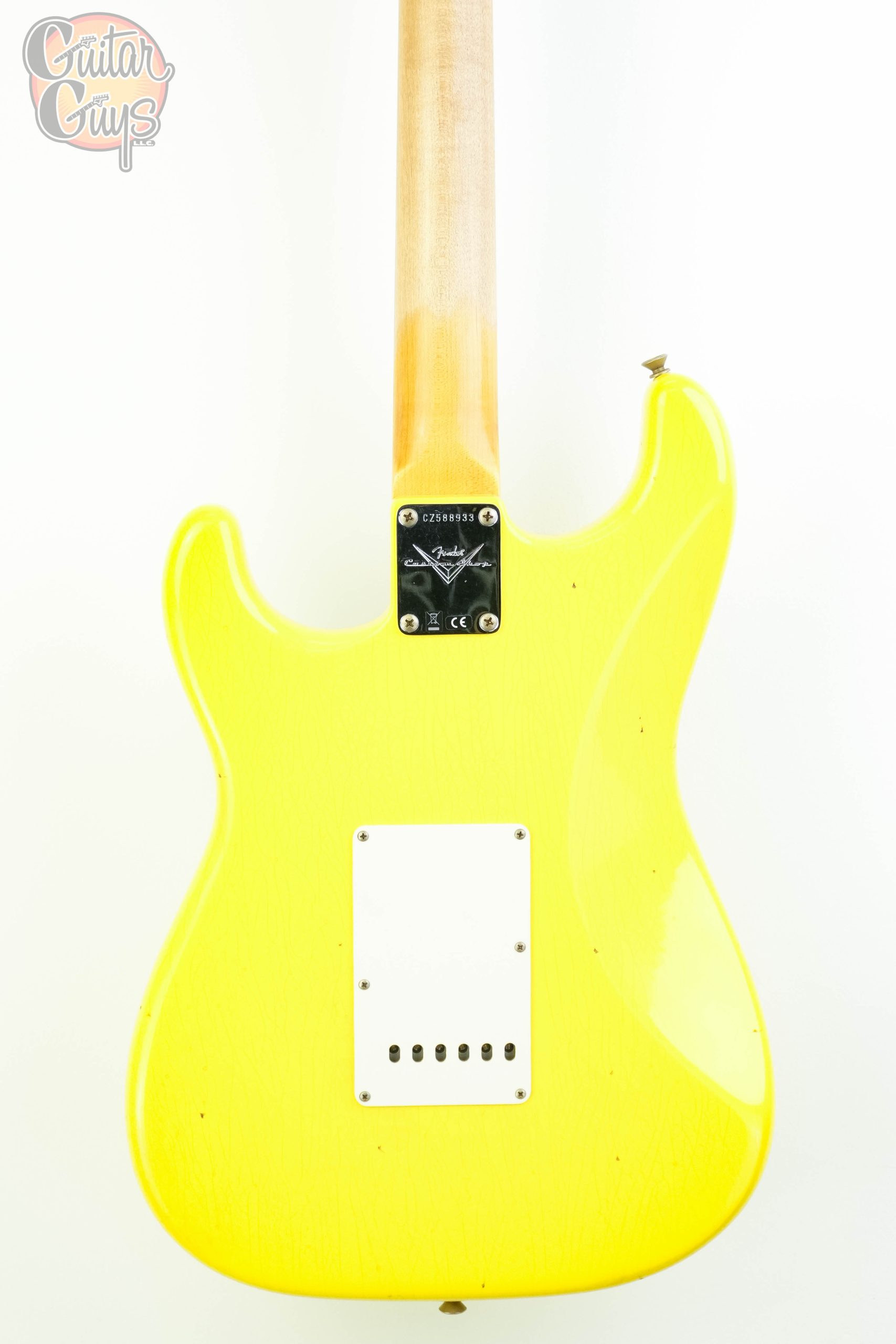 The Fender Custom Shop ’59 Stratocaster HSS Journeyman Relic in Graffiti Yellow is a vintage-inspired electric guitar with a humbucker in the bridge position and single-coils elsewhere (HSS). It features a relic-style finish that mimics natural wear, a 2-piece select alder body, a AA Flame quartersawn maple neck with a 11/56 Off Center V shape and a AAA Rosewood fretboard. The Journeyman Relic finish is less heavily distressed than a Heavy Relic, with playwear on the body and hardware.