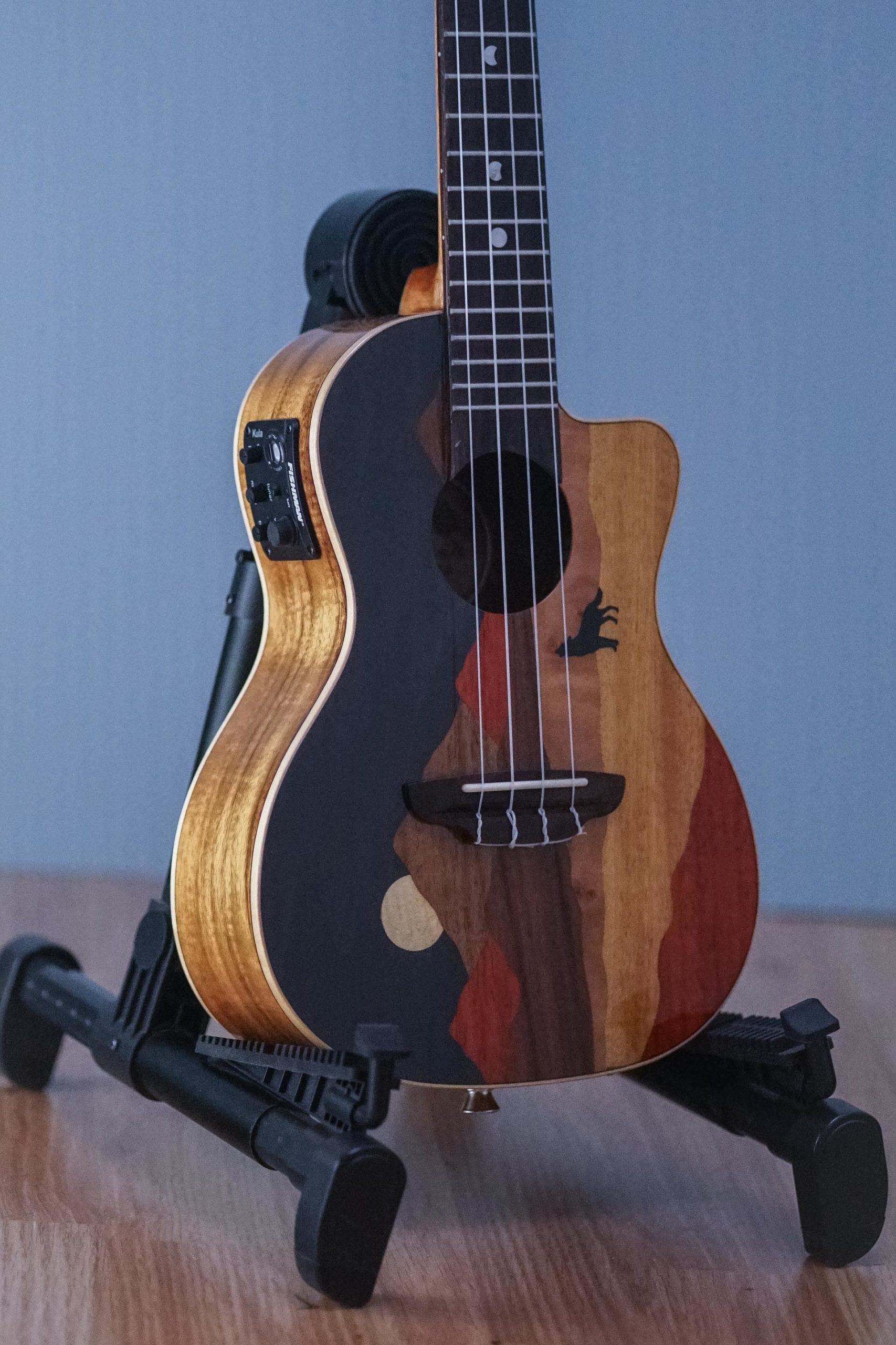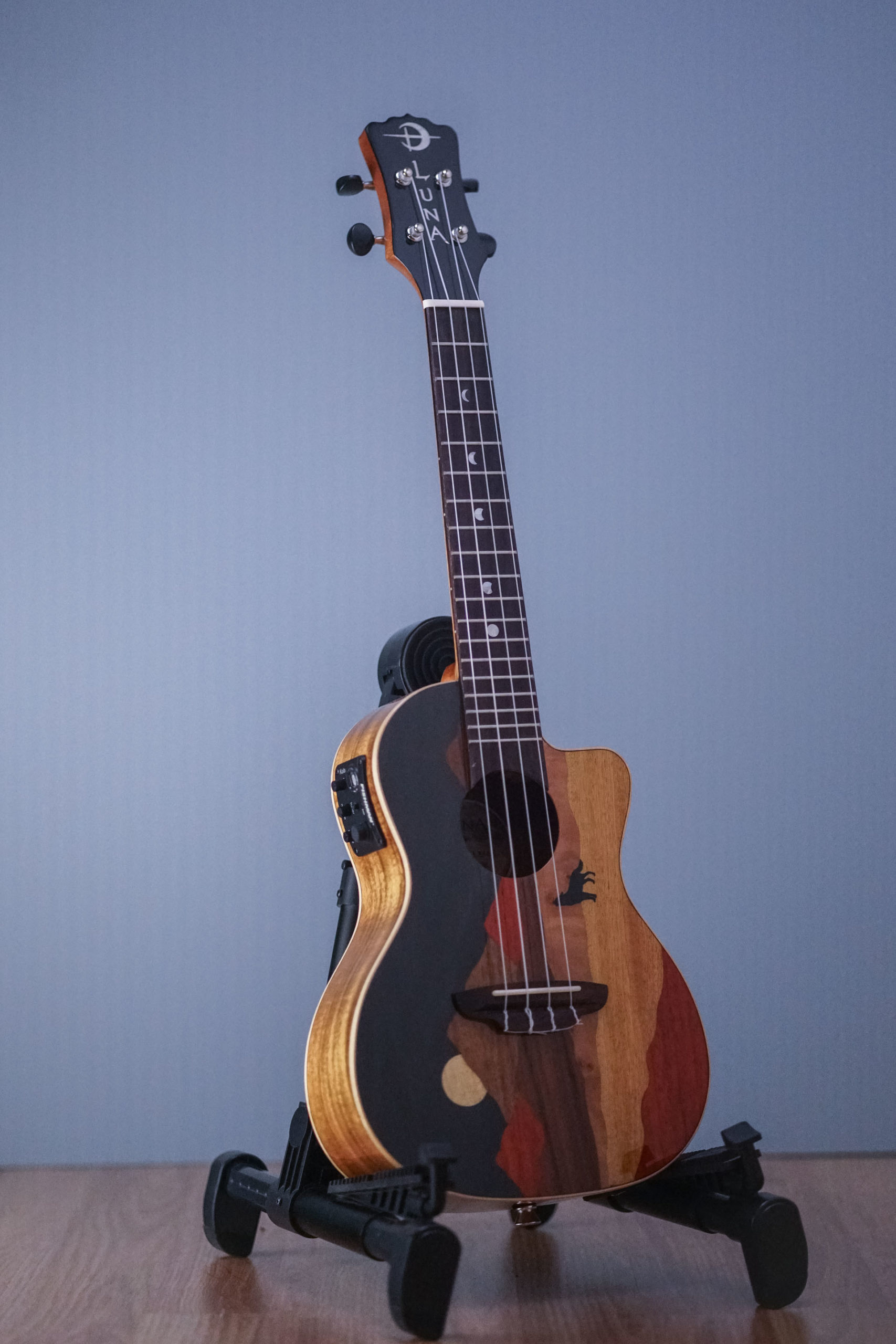 The Vista Wolf concert ukulele features a gloss finished, maple binding, concert body with a cutaway and Koa back and sides for enhanced tone and projection. Showcasing a skillfully crafted top, the Vista Wolf Concert is made from attractive tone-woods that bring its unique panoramic image to life. Handmade from a combination that includes padauk, bird’s eye maple, Koa, and Flame Maple, each ukulele is a completely unique work of art. Precision fitted with a 15 scale mahogany neck with pearloid moon phase inlays on a black walnut fretboard the, Vista Wolf ukes feel, playability, and stand-alone acoustic sound are nothing short of inspirational. Once plugged in, the Vista Wolf takes off in yet another sonic direction. Owing to a Fishman Kula with built-in tuner, youll hear clear, strong, natural acoustic sound on stage. Whether plugged-in or not, the incredible tone from the Vista Series offers pristine clarity and unique visual presence make it the ideal instrument to make your musical statement. So, what are you waiting for? Padded gigbag included. Join the Luna Tribe!