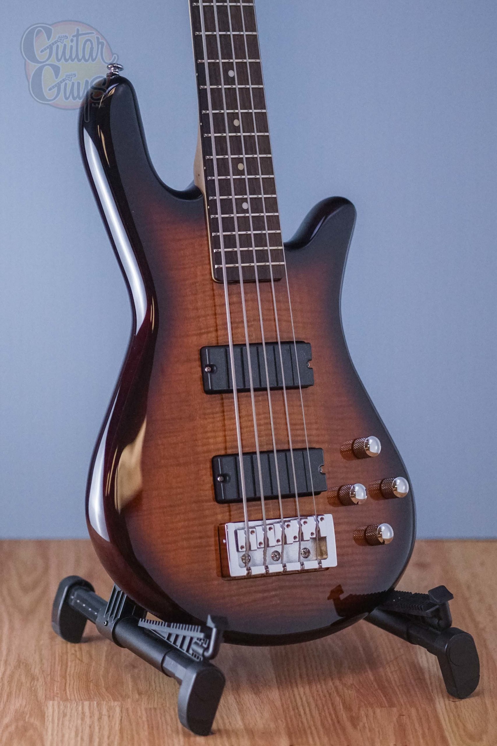 Spector Legend 4 Standard (Black Cherry) The Legend 4 Standard offers the coveted Spector NS body design at a price that is well within the reach of all bassists. The extremely comfortable curved body is crafted from lightweight, solid ash and sports a genuine flame maple top. The five-piece maple and padauk neck features a 24 fret amara fingerboard that’s perfectly tapered for comfort. The Legend Standard also features professional quality chrome hardware, including hi-mass bridge that provides rock solid intonation and performance. Specially designed open coil Spector P/J style pickups provide this bass with a clear, punchy tone. The pickups are complemented by a versatile two-band active EQ controls that offer 12dB of boost or cut for both treble and bass controls. Adorned with a high gloss finish, the Legend 4 Standard provides the looks, tone, and feel of basses twice its price.